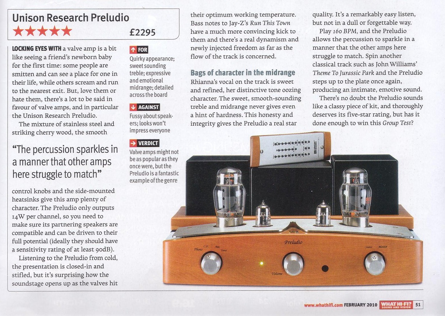 В продолжении модельного ряда полных усилителей серии Valve 2006 года, где флагманом выступает модель Performance и усилителем премиум класса Sinfonia компания Unison Research начинает выпуск младшего лампового триодного усилителя Preludio. Усилитель сконструирован по схеме Dual Mono, предварительная часть построена на двойных триодах ЕСС82, а выходной каскад на двух тетродах КТ88. Выходная мощность 2х14 Вт. Усилитель комплектуется пультом ДУ.
